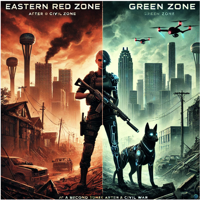 The Eastern Red Zone (ERZO) is a dangerous, lawless area outside the control of the Texas State government. Here, survival is a daily battle, cyberdog patrols and militia raids are constant threats, but the ERZO also offers a semblance of freedom for those resisting State authority.